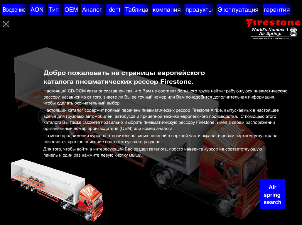 Настоящий каталог содержит полный перечень пневматических рессор Firestone Airide, выпускаемых в настоящее время для грузовых автомобилей, автобусов и прицепной техники европейского производства. С помощью этого каталога Вы также сможе правильно выбрать пневматическую рессору Firestone, имея в своем распоряжении оригинальный номер производителя (ОЕМ) или номер аналога. По мере продвижения курсора относительно синих панелей в верхней части экрана, в левом верхнем углу экрана появляется краткое описание соответствующего раздела.